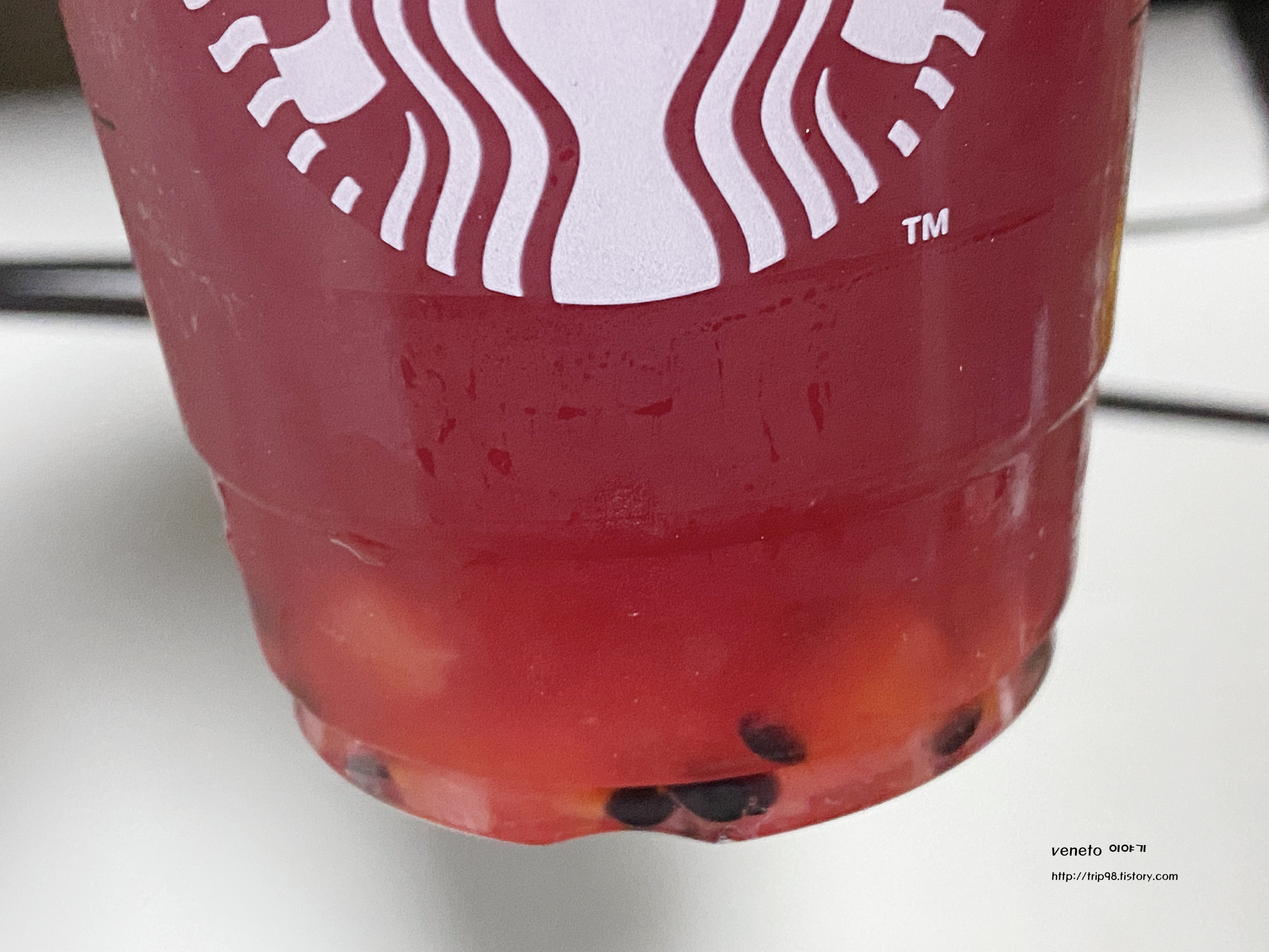 안에는 패션 푸르트 베이스에 들어가있는 3종류 정도의 과일이 들어가있었습니다. 씨앗같은것도 있어서 치아 조심해야할것 같아요. 한입 먹어보면 패션 탱고 티 레모네이드 피지오 처럼 달달, 새콤, 패션 티의 향이 잘 느껴져요. 클래식 시럽도 들어가서 달달한듯 합니다. 벤티 사이즈 기준 5번정도 들어가는데 개인적으로는 3번정도가 나을듯 해요.